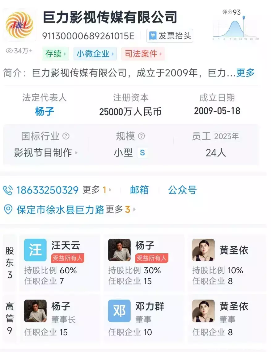知识产权信息显示,巨力影视传媒有限公司曾申请注册多枚“黄圣依”“杨子”商标,国际分类涉及广告销售、教育娱乐等,当前商标状态多为已注册。